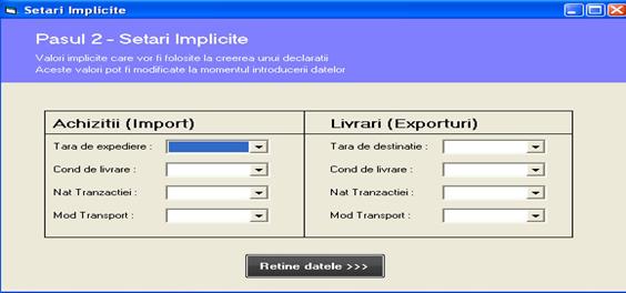 Aceste setari implicite sunt folosite pentru automatizarea procesului de introducere a datelor din facturi. Spre exemplu daca majoritatea achizitiilor comunitare au conditia de livrare EXW atunci introduceti valoarea EXW la setari implicite pentru achizitii. Aceasta va ajuta la introducerea datelor, la fiecare pozitie introdusa programul va propune automat conditia de livrare EXW.