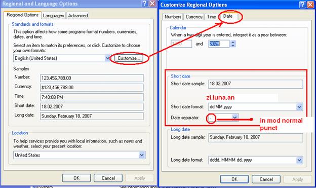 Pentru formatul datei si a numerelor : Start -> Settings -> Control Panel -> Regional and Language Options -> Customize -> Tabul „Date”.